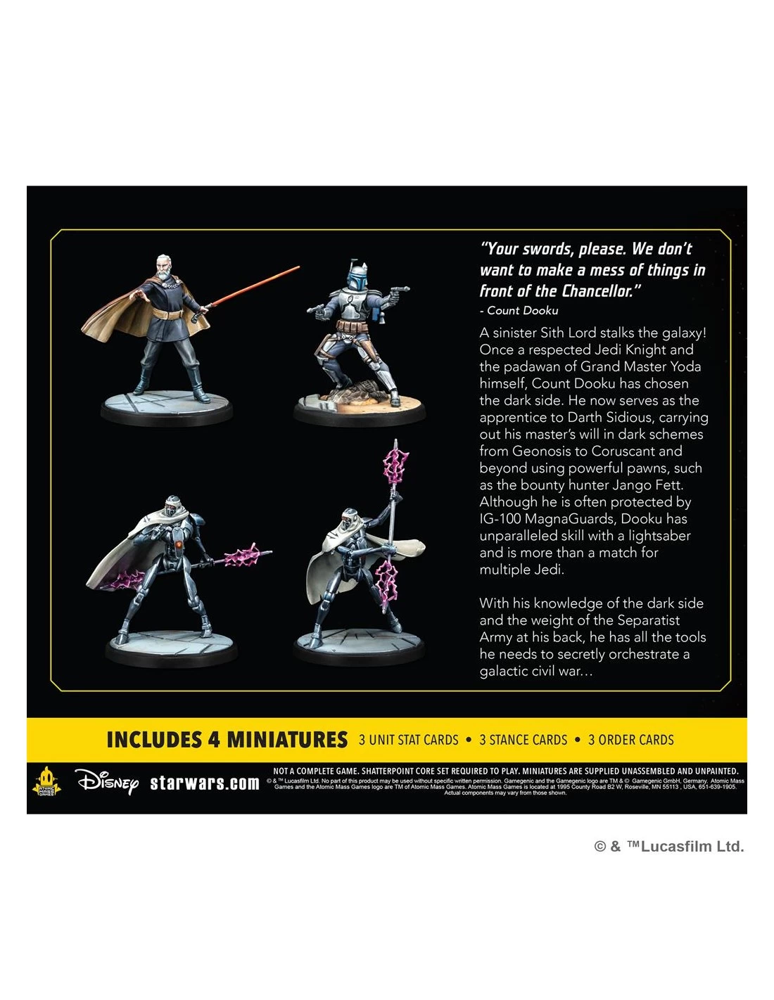 A sinister Sith Lord and his minions enter the duels of Star Wars: Shatterpoint! Once a respected Jedi Knight and the padawan of Grand Master Yoda himself, Count Dooku has chosen the dark side, now serving as the apprentice to Darth Sidious himself. This pack adds a new squad of Count Dooku, Jango Fett, and 2 IG-100 MagnaGuards to Star Wars: Shatterpoint that players can play right away or use alongside other characters to create their own custom squad. In addition to the beautifully sculpted miniatures of all four characters, players will also find the all the cards they need to bring these characters to life on the tabletop.