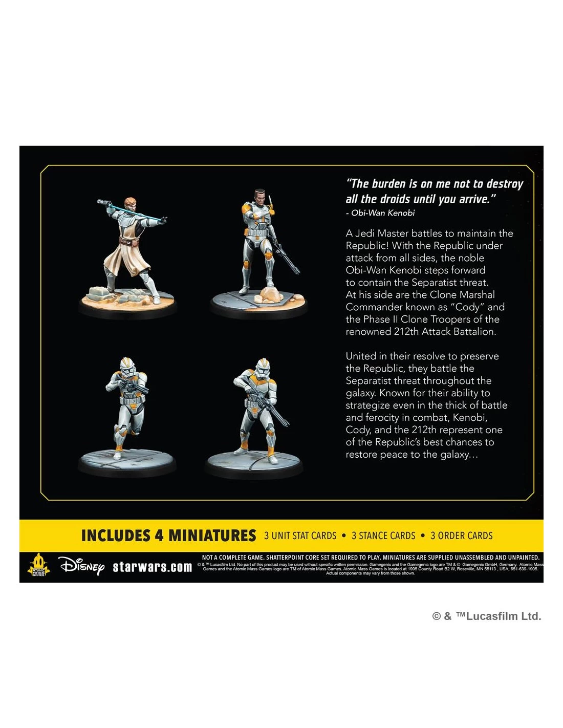 An iconic Jedi General and his allies enter the duels of Star Wars: Shatterpoint in this pack! One of the Republic’s most iconic heroes, Obi-Wan Kenobi fights to contain the Separatist threat no matter the cost and this pack adds him, Clone Commander Cody, and two Phase II Clone Troopers from the renowned 212th Attack Battalion to Star Wars: Shatterpoint. Whether using them together as full squad or combining them with other characters, the beautifully sculpted miniatures in this pack are accompanied by all the cards players need to unleash their unique abilities on the battlefield.