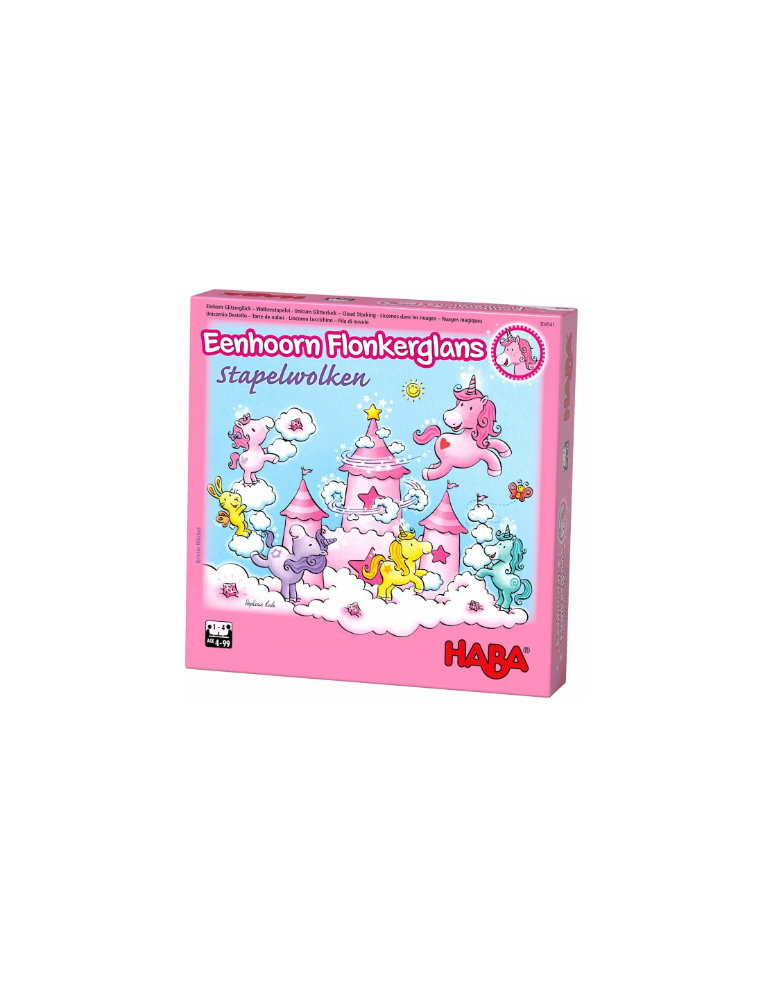 Contents: 4 unicorns: Glitterluck (hot pink), Stardust (yellow), Marvel Flower (purple), and Magic Swirl (turquoise), 1 baby unicorn Rosalie (pink), 1 cloud castle, 5 large white clouds and 5 smaller blue clouds, 1 die, 1 cloud game board, 16 double sided cloud tiles, 10 cloud crystals and instructions booklet