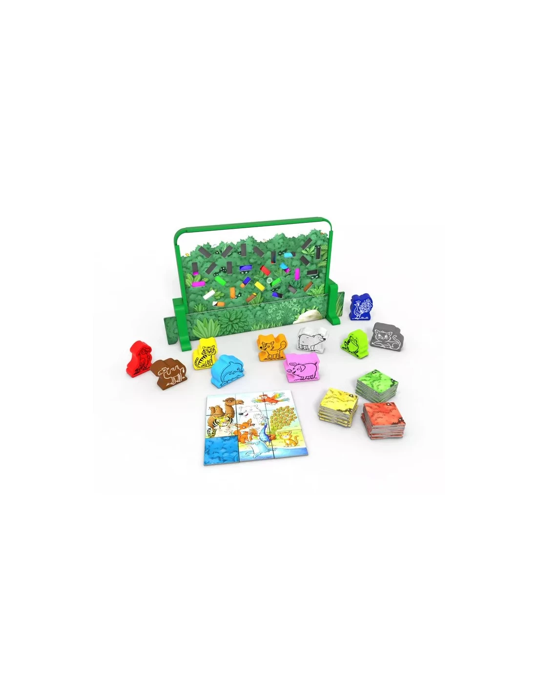 The centerpiece of the game is a “thicket”, that is, a large vertical container that represents a bunch of bushes. Inside this container are twenty wooden discs, two each of ten colors, and you can see these discs inside the thicket through 29 cut-out slots. However, the thicket is designed so that five of the discs will fall into grooves at the bottom of the vertical container, and the discs in these grooves will be hidden by a piece of cardboard underbrush so that they are not visible until you remove the underbrush during play. Ten animals in the colors of the discs are set up in the center of the playing area within reach of all players. Each player also has a stack of nine tiles that when placed together form a picture.