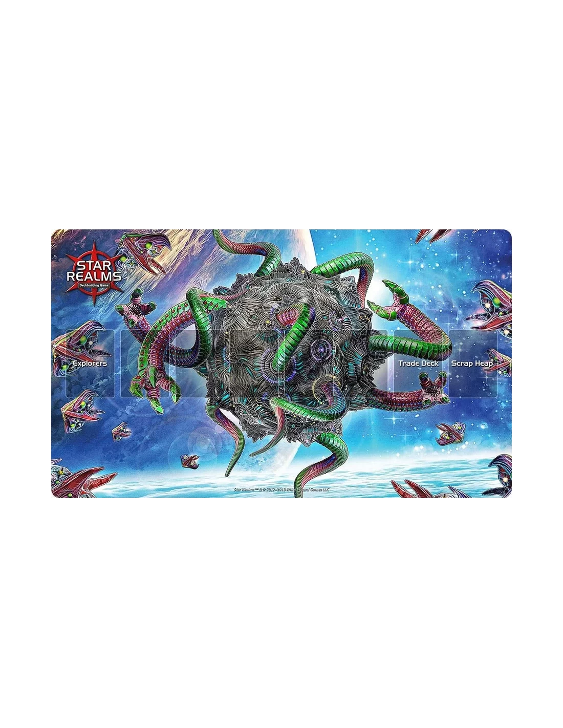 This large neoprene playmat supports up to six players and includes spaces for the Trade Deck, Trade Row, Explorers, and Scrap Heap. It measures 24โ x 14โ (61cm x 35.5cm).