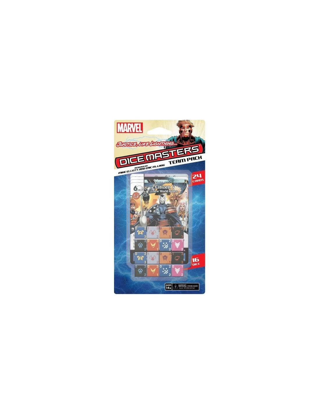 The Marvel Dice Masters: Justice, Like Lightning… Team Pack includes members of the Thunderbolts team, with Citizen V, Songbird, and Techno all making an appearance. Team Packs each include 24 cards and 16 dice, representing eight different characters, and can be combined with any Dice Masters boxed set.